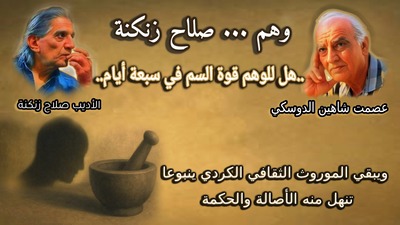 في البدء كانت الكلمة.. وكل شيء بها.. وبغيرها لم يكن هناك شيء فيها .. كانت الحياة نوراً لكل البشر... وفي ظل هذه الحياة مواعظ وعبر كثيرة.. نستلهم منها التفكير الصحيح والسبل التي تأخذنا إلى بر الأمان.. بر الحب والخير والوئام .. الموروث الكردي الثقافي زاخر بالقصص التي تعبر عن أصالة الشعب الكردي وتفكيره، غيرته، عواطفه، شجاعته و حكمته... ومن هذا الموروث الأصيل قصته (الوهم) التي كتبها صلاح زنكنة وهي قصة قصيرة مستوحاة من الموروث الثقافي الكردي