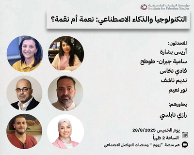 تدعوكم مؤسسة الدراسات الفلسطينية إلى حضور ندوة عنوانها: "التكنولوجيا والذكاء الاصطناعي: نعمة أم نقمة؟"