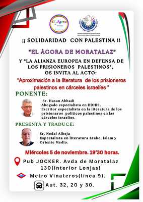 شاركتُ في ندوة عقدها التحالف الأوروبي لمناصرة أسرى فلسطين في إسبانيا، و"EL AGORA DE MORATALAZ" تناولت أدب الحريّة، وما يجري في سجون الاحتلال، وجاءت مشاركتي بصفتي عضو اللجنة القانونية والاستشارية للتحالف، وقد حضرها عشرات الناشطين الإسبانيين المهتمين بالقضية الفلسطينيّة.