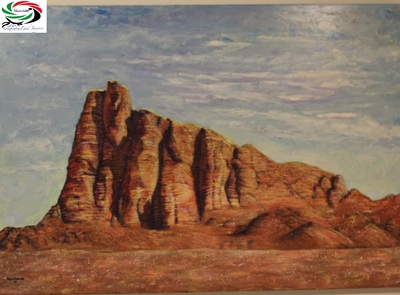 في لوحة أخرى، كانت السماء حمراء تتخللها توشيحات بالأصفر والشمس تتهيأ للغياب، وتظهر في قاعدة اللوحة جبال رم، ما يترك المشاهد في حالة صمت وتأمل. وفي مشهد ثالث، تظهر الشمس في الأفق على وشك الغياب خلف الجبال، بينما الرمال الممتدة أمامها متماوجة الألوان، مما أضفى على اللوحة جمالًا إضافيًا. وقد أنهت مشاهد الغروب بلوحة لتلال صخرية أمام الشمس في لحظة غروبها، وأخرى لمقطع صخري بتماوج لوني نادر، مما منح اللوحات محاكاة كبيرة للطبيعة وجماليات خاصة في البناء اللوني والتباين بين الداكن والفاتح.