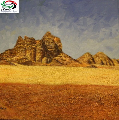 واختتمت الفنانة معرضها بالمحور السابع، بلوحة تحمل أبعادًا فلسفية لشجرة خضراء في قلب الصحراء، تتناثر أمامها الحجارة، وخلفها جبال رم، وكأن الشجرة تهمس: رغم قسوة الطبيعة، هناك في هذه الأرض ما يجعلنا نواصل الحياة وننتصر.