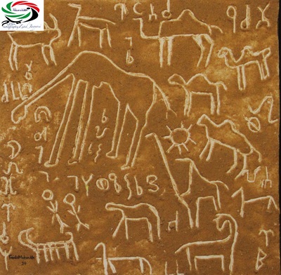 المحور الثالث تناول النقوش المنتشرة في البتراء، خصوصًا في السيق وهي رموز من حروف وأشكال مختلفة، ومنها منحوتة قافلة الجمال، والرموز النبطية الوثنية قرب قنوات المياه بسبب ايمان الأنباط بقدسية المياه، ونقوش باليونانية القديمة تشير إلى شخصية تاريخية تدعى سابينوس. بجوار منحوتات "أصنام سابينوس" تشير انه كان ابنا للاسكندر، وأمر بنحت هذه المنحوتات تكريما للآلهة النبطية، رسمت الفنانة لوحتين لهذا المحور، إحداهما لقافلة الجمال، والأخرى لمنحوتات رمزية وأشكال حروف يونانية. أما المحور الرابع والأخير للبتراء فكان لوحة واحدة للخزنة، إذ كان تركيز الفنانة منصبًا على همهمة الصخور أكثر من الرموز المعمارية.