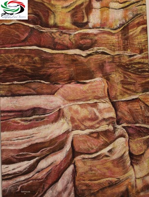 كان المحور الأول في المعرض مخصصًا للبتراء، حيث ركزت الفنانة على أربعة محاور أساسية. خصصت اثنتي عشرة لوحة لصخور البتراء الملونة، التقطت فيها بعينها الفنية جمالية الصخور التي هي بحق إبداعات الخالق في الطبيعة، وحوّلتها من صخور صمّاء إلى لوحات فنية نابضة، تكشف جماليات قد تمرّ على كثير من الزائرين دون انتباه خاص. بعضهم يكتفي بالإعجاب العابر، وقليلون هم من يلتقطون هذا الجمال ويحيلونه إلى فن خالد، سواء عبر الريشة أو عدسة التصوير. والفنانة هنا لم تكتفِ بنقل جمال الصخور بالألوان، بل مزجت في العديد من اللوحات حصى ورمال هذه الصخور، فجاءت اللوحات نافرة الملمس، أقرب إلى القلب، وكأننا نستمع فعلاً لهمهمات الصخور.