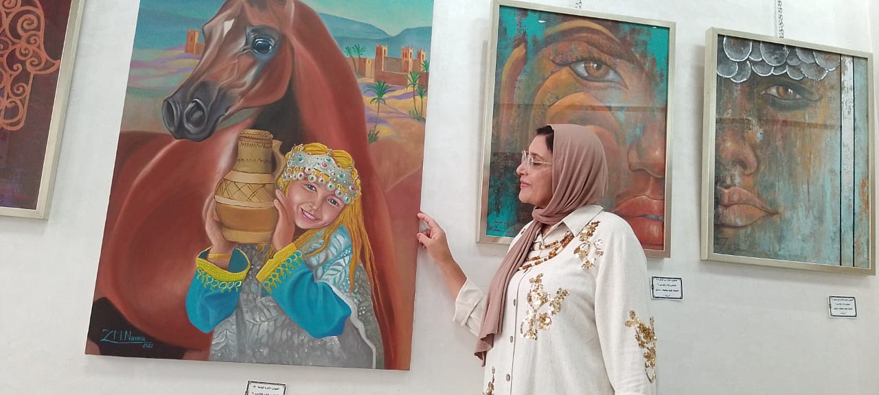 لوحات الفنانة احصنة مطهمة لها نخوة التراث والفروسية والموروث المجتمعي الموغل في الجمال، ونساء وقورات تطل من نوافذ العادات والتقاليد المغربية الأصيلة، انها تلك الفتاة التي تعانق جرة الحلم برائحة الطين على ظل صهيل خيول ترفض لجام القهر، وتنشد براءة الحرية.